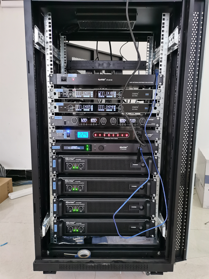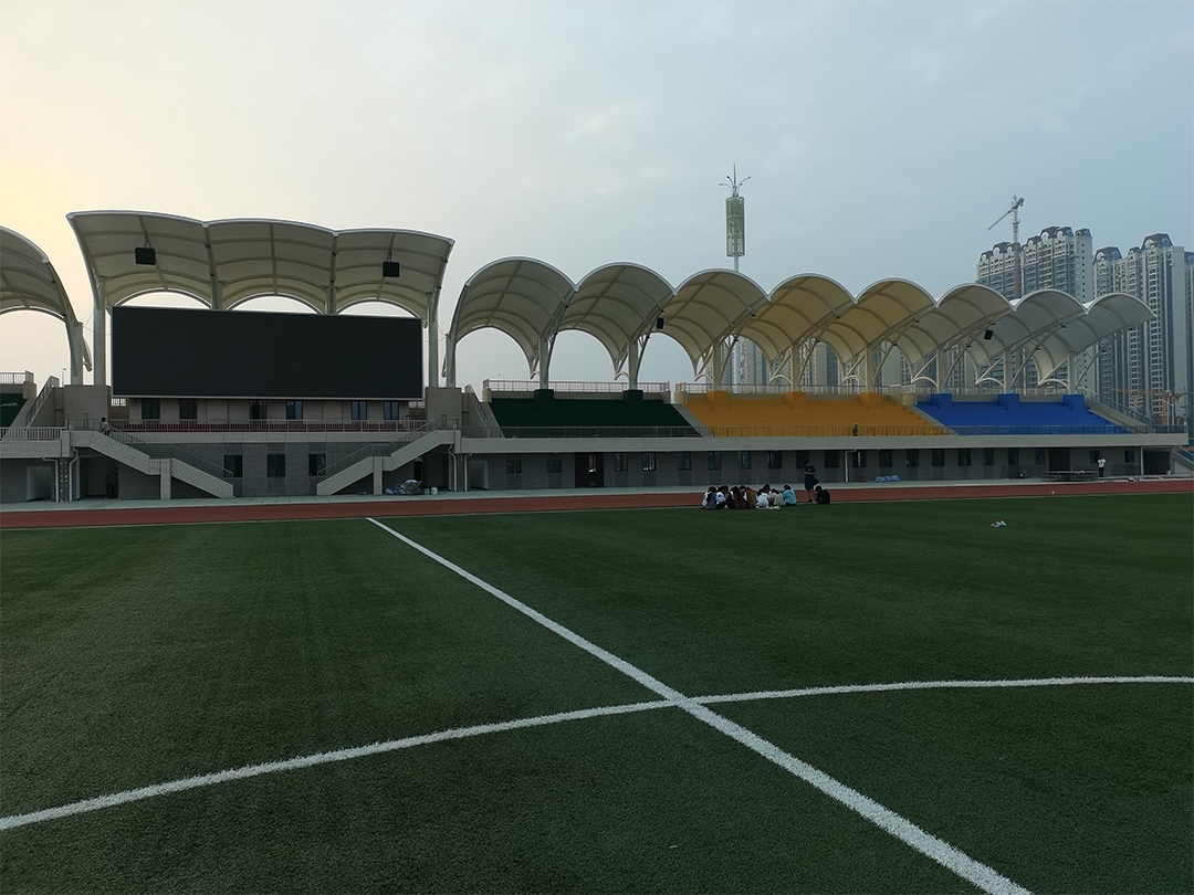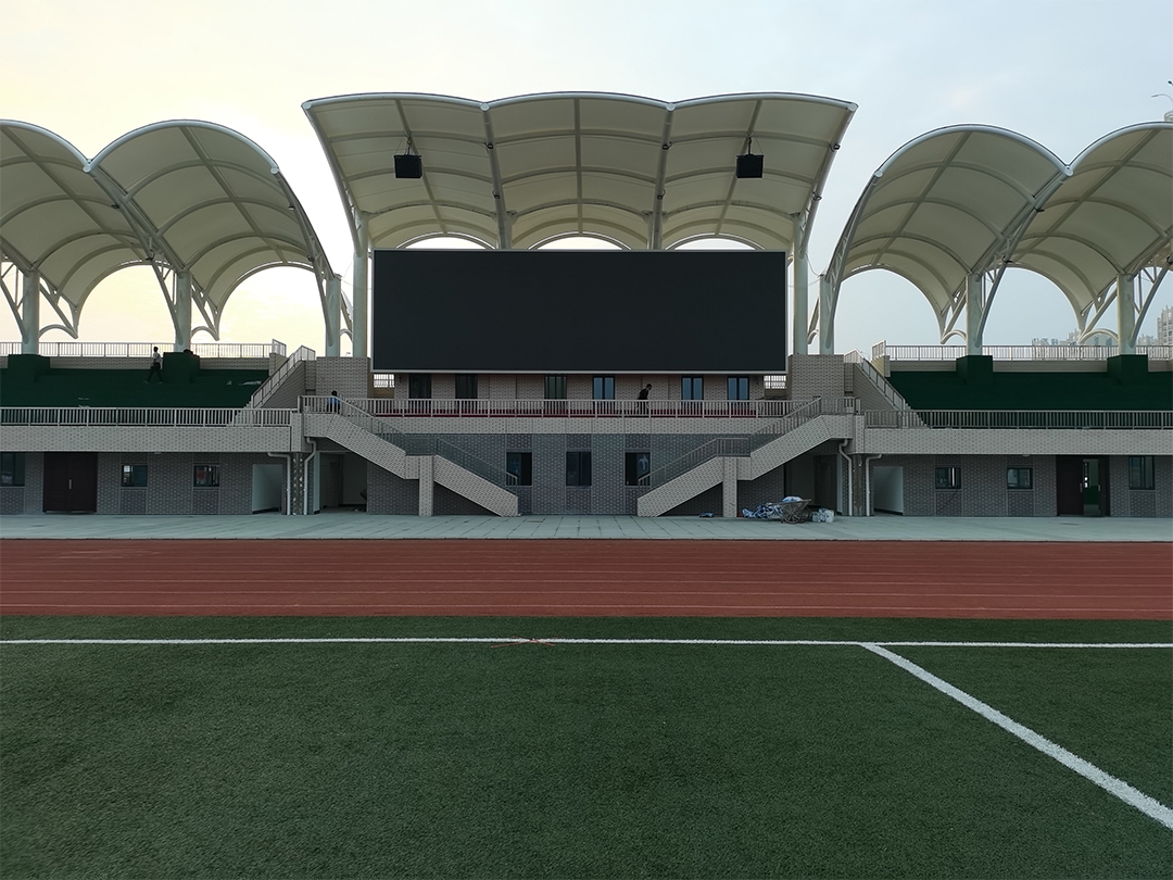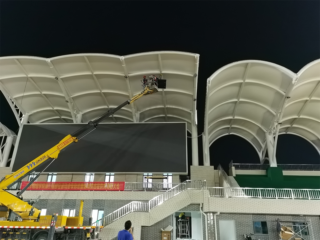 本次安装难度大,工期紧,采取了吊车安装及多人合作的方法,为学校操场构筑起了一个优质的专业音响扩声平台。