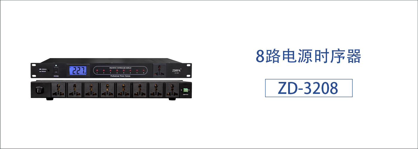 8路大功率电源输出,一键控制电源时序动作,可选通电即启和手动功能,适合于音响工程,电视广播系统,电脑网络系统及电力设施等需要按秩序电源分配系统的场合ZD-3208电源时序器能够按照由前级到后级逐个顺序启动设备,关闭供电电源时则由后级到前级的顺序关闭用电设备,这样就能够有效的统一管理控制各类用电设备,避免了人为地失误操作。确保了整个音响用电系统运行时的稳定性